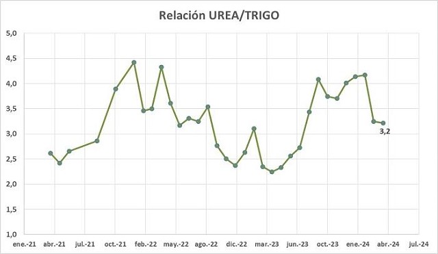 En esta campaña, el precio de la urea está 80 u$s más alto (630 u$s/tn), por lo que la relación urea/trigo es de 3,2. Pero esta relación está mucho mejor que a principios de este año, ya que en febrero había estado en 4,2.