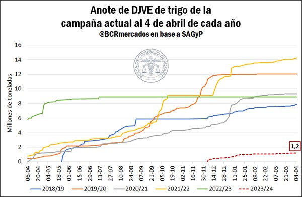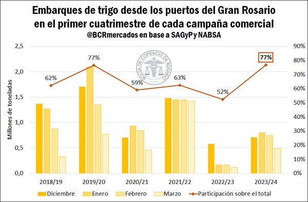 Estos números guardan sentido dado que aproximadamente 5,8 Mt de trigo comprometido a exportarse durante 2022/23 se rollearon – tras previa autorización - para embarcarse este año ante el contexto de una extraordinaria sequía, por lo que se estima que la mayor parte de las exportaciones que se efectúen durante esta campaña ya han sido declaradas durante el ciclo previo. De hecho, de las 4,7 Mt del cereal exportadas de diciembre a marzo, sólo 467.200 toneladas tenían previsto despacharse de acuerdo con el anote de DJVE de trigo 2023/24, lo que indica que casi la totalidad de la mercadería se exportó para cumplir con compromisos previamente asumidos.
