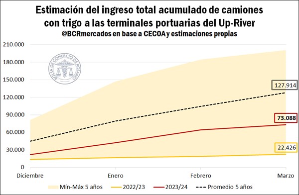 En este contexto, se estima que el ingreso de camiones con trigo a la zona portuaria del Gran Rosario durante los primeros cuatro meses de la campaña 2023/24 totalizó casi 73.100. Este volumen, si bien más que triplica el alcanzado en igual período de la campaña previa, se ubica un 43% por debajo del promedio de 128.000 camiones observado durante los últimos cinco años, y muy por detrás del máximo de 200.800 camiones alcanzado en la campaña 2019/20.