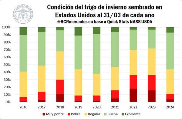 Por su parte, durante el lunes de esta semana, el Departamento de Agricultura de los Estados Unidos (USDA, por sus siglas en inglés) retomó la publicación semanal de su informe de progreso de cultivos. En este, se dio a conocer que el 56% del trigo de invierno estadounidense sembrado se encuentra en condicionas buenas y excelentes, una impresionante mejora si se tiene en cuenta que para esta misma altura del año 2023 apenas el 28% de los cereales implantados alcanzaban esta condición. Asimismo, sólo el 11% de los cultivos muestra condiciones pobres y muy pobres, frente al 36% informado hace un año atrás.