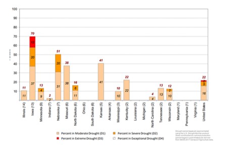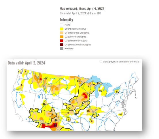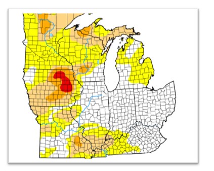 Es visible la situación de moderada sequía e incluso de extrema sequía. El incipiente problema afecta a la parte occidental del Medio Oeste y a buena parte de las grandes planicies.