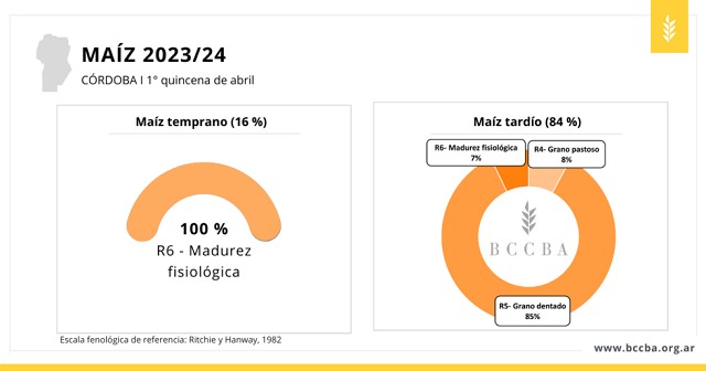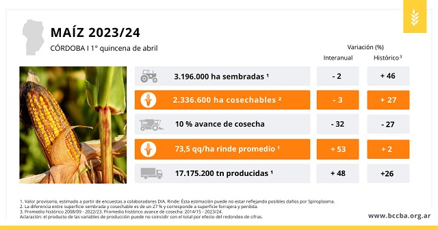 El 100 % de la superficie del maíz temprano y el 7 % de maíz tardío ya se encontraban en madurez fisiológica, con un avance de cosecha del 10 %, cifra 30 puntos porcentuales por debajo de la campaña 2022/23 para la primera parte de abril.