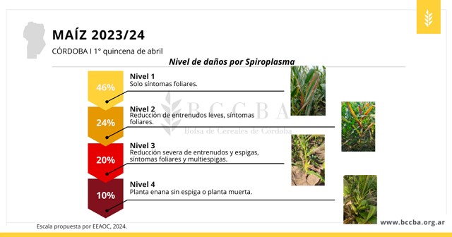 Se clasificaron los niveles de daños de la enfermedad según la escala propuesta por el EEAOC (2024). A nivel provincial, la superficie afectada por Spiroplasma, se distribuyó con un 46% en el nivel 1, 24% en nivel 2, 20% en nivel 3 y 10% en nivel 4. Se observaron los 4 niveles conviviendo en un mismo lote. Cabe aclarar que los departamentos Río Seco y San Justo duplicaron la proporción de lotes en el nivel 4 respecto al promedio provincial. El nivel 4 refleja la peor gravedad de la situación.