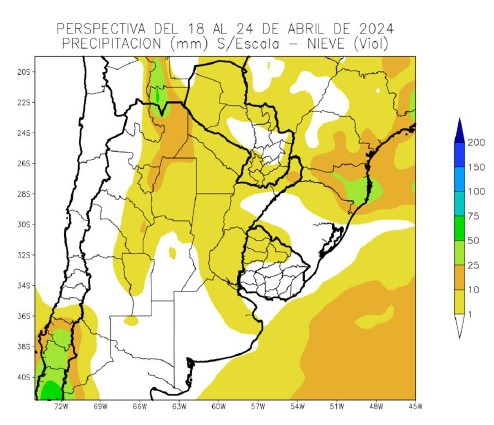 Al comienzo de la perspectiva se producirán precipitaciones abundantes, en gran parte del área agrícola norteamericana, mientras gran parte del norte y el centro-norte de su extensión observarán nevadas tardías. Paralelamente, se producirá la entrada de aire polar con riesgo de heladas generales en el norte parte del Cinturón Maicero, y de heladas localizadas en el norte y centro del área triguera, el sur del Cinturón Maicero y el norte de la Región Sudeste.
