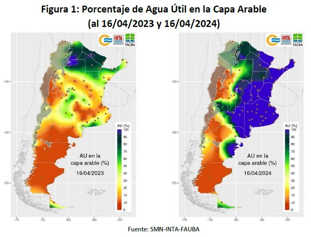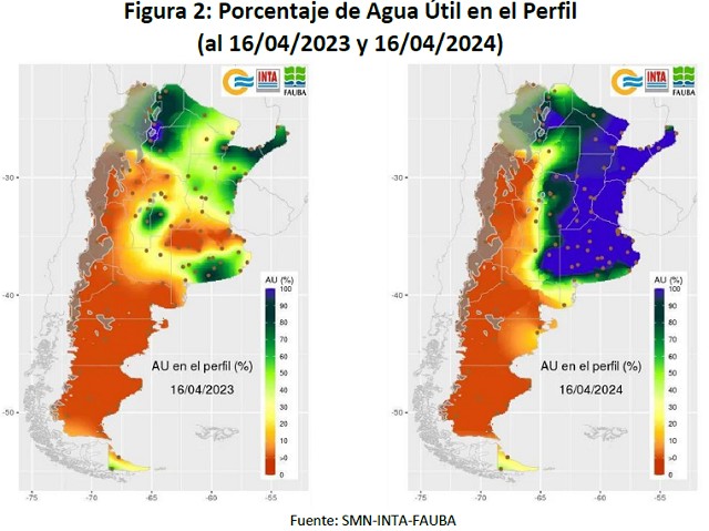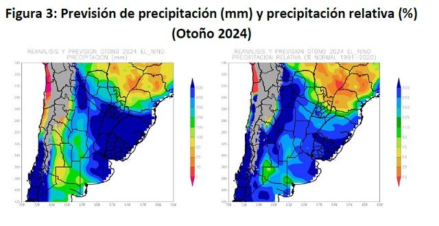 Para la primavera del año 2024, comenzarían a manifestarse la baja en las precipitaciones y el aumento de las temperaturas respecto a los valores normales en la mayor parte del área agrícola, a excepción de la región NOA y el noroeste de la región del Chaco que experimentarían un comienzo de la temporada de lluvias normal a superior a lo normal. Sin embargo, para el verano el fenómeno de “La Niña” alcanzaría su máxima expresión y se extendería sobre todo el territorio nacional, donde solo algunos focos aislados del centro del área agrícola recibirían aportes normales a algo superiores a lo normal.