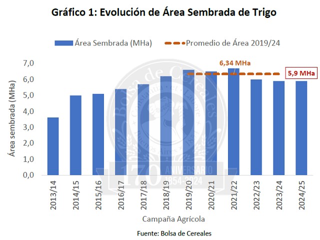 En consecuencia, tras la recopilación de los datos más relevantes que delinearían la intención de siembra para el próximo ciclo, se observa una posible estabilidad en el área de siembra del trigo, igualando las 5,9 MHa alcanzadas durante el ciclo anterior, quedando este valor supeditado a la evolución de las variables no solo climáticas, sino principalmente de las económicas de aquí hasta el momento de comenzar con las labores de implantación. Al analizar esta cifra en un contexto más amplio, observamos que esta proyección de superficie representa una disminución del 6,9% en comparación con el promedio de las últimas cinco campañas.