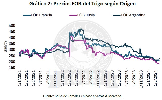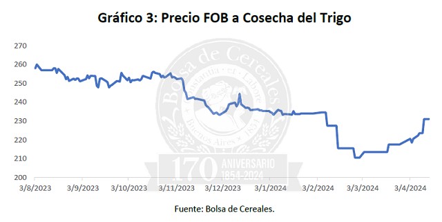 En el plano local, desde principios de marzo, el precio promedio FOB a cosecha del trigo en Argentina ha experimentado una recuperación, alcanzando los 230 USD por tonelada, lo que representa un incremento del 10%, o una ganancia acumulada de 20 USD por tonelada. Este aumento se produce después de las significativas caídas registradas desde abril del año anterior, que resultaron en una reducción acumulada del 19%.