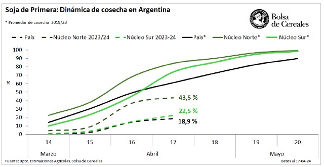 Precipitaciones demoran el avance de la cosecha de la oleaginosa, registrando una demora de 22 p.p. respecto al promedio de las últimas cinco campañas. Con un avance del 13,9 %, el rinde medio nacional se ubica en 34,4 qq/Ha.