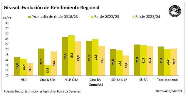 Finalmente, se da por finalizada la cosecha de girasol 2023/24. Si bien se registran lotes remanentes aún en pie en sectores del sudoeste del área agrícola, demorados por las lluvias de la última semana, no alterarían los resultados de la actual estimación. El ciclo cerró con un rinde promedio de 20,2 qq/Ha y una producción de 3,6 MTn, un 21,7 % por debajo del volumen alcanzado en el ciclo anterior y un -1,1 % por debajo del promedio de los últimos 5 años.