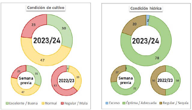 Por su parte, el avance de la cosecha de maíz grano comercial también se vio afectado por los abundantes acumulados de precipitaciones en gran parte del área agrícola durante los días previos al presente informe. Hasta el momento, se ha cosechado el 17,2 % del área estimada, reportando un rendimiento promedio de 87,9 qq/Ha. En particular, en el Núcleo Norte el 76 % de los planteos tempranos ya fueron cosechados, manteniendo una demora de -15 p.p. respecto al promedio 2018/22. En lo que respecta a los planteos de siembra de noviembre en adelante, la condición continúa en caída en las zonas afectadas por la chicharrita, aunque estas lluvias asegurarían una culminación del llenado de granos en óptimas condiciones hídricas en las zonas con baja incidencia de la enfermedad.
