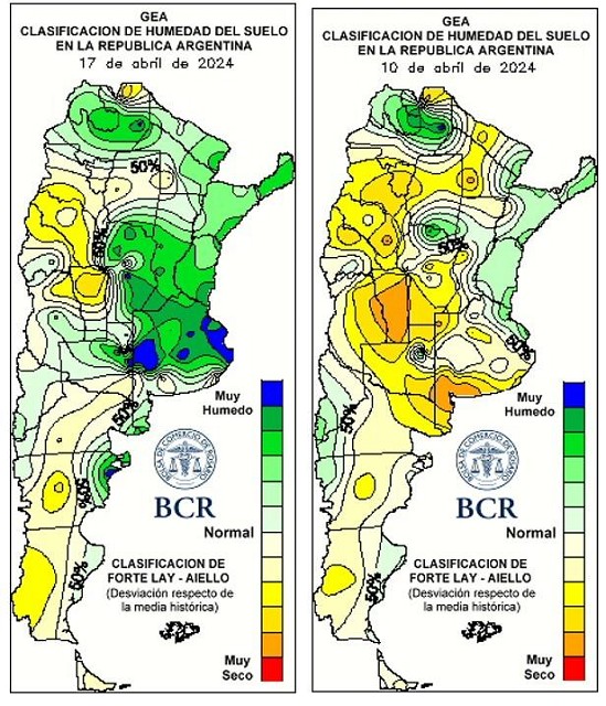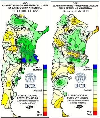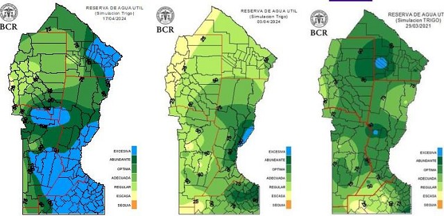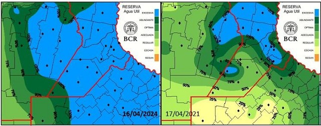 Hace cuatro años, el 80% del territorio de Santa Fe tenía condiciones óptimas; hoy el 47% tiene excesos y el resto muestra reservas óptimas a abundantes. En Córdoba, el 70% del área estaba en condiciones óptimas, cuando al presente el 27% tiene excesos y el resto óptimas a abundantes a excepción del área que rodea a Villa María que recibió solo 40 mm este fin de semana. En este año, el noreste bonaerense está en su mayor parte con excesos, cuando solo el 23% tenía condiciones óptimas a principios de abril de 2021.