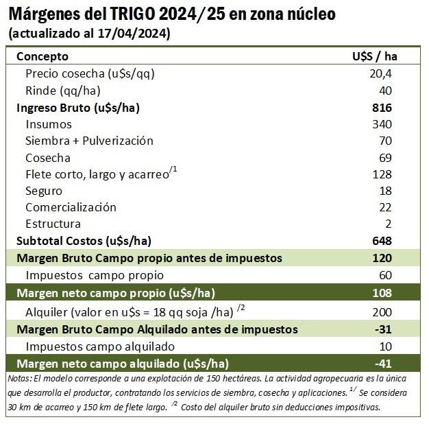 Según la última actualización de precios al 17 de abril, los márgenes en campo propio han mejorado en 36 u$s/ha respecto a 15 días atrás, pasando de 72 u$s/ha a 108 u$s/ha. En campo alquilado, si bien los márgenes continúan siendo negativos para una productividad de 40 qq/ha, también han experimentado una variación positiva de 49 u$s/ha.