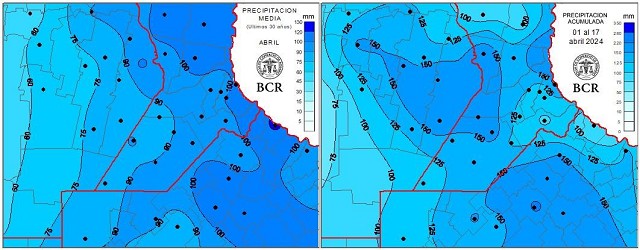 La media de todo abril para la región núcleo es de 90 mm, con grandes diferencias entre este y oeste. Sin embargo, hasta el 17 de abril la media de la región era de 136 mm, un 50% más que el promedio mensual. El atípico posicionamiento en áreas más mediterraneas del centro de baja presión y “El Niño” fuerte dejaron 5 días de lluvias problemáticas para la cosecha, pero que han cambiado las condiciones para el trigo 2024/25 en la región núcleo y gran aparte de la región pampeana.