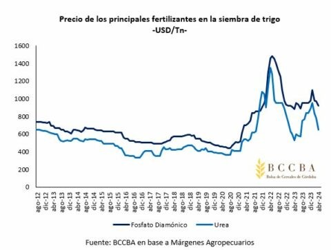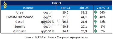 Como se observa en la siguiente tabla, los ratios respecto a los insumos seleccionados han aumentado. Como ejemplo, el caso de la urea, con un aumento interanual del 64% implicaría que son necesarios 31,2 quintales de trigo para adquirir una tonelada de urea, en comparación a los 19 quintales necesarios en abril del 2023. Con lo cual, el trigo estaría perdiendo poder de compra respecto a los insumos considerados.