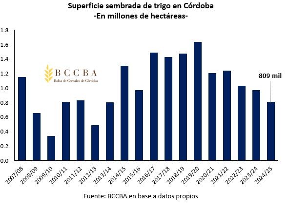 Según la primera estimación de intención de siembra de trigo en Córdoba para la campaña 2024/25 realizada por el departamento de información agronómica de la institución (D.I.A – BCCBA), la superficie destinada al cereal se ubicaría en torno a 809 mil hectáreas, disminuyendo un 17% respecto a la campaña previa y posicionándose como la menor superficie de las últimas 11 campañas.