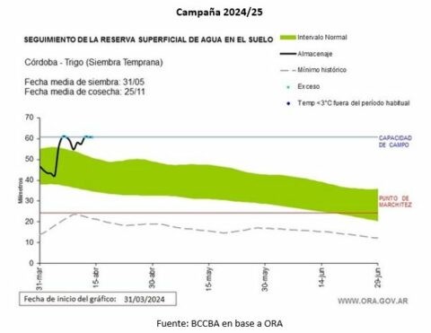 En cuanto al agua útil en el perfil durante la primera quincena de abril, las condiciones para la campaña 2024/25 se muestran mucho más favorables comparadas con las observadas al inicio del ciclo 2023/24. Como se presenta en el siguiente gráfico, al momento de la siembra del cereal en el periodo pasado, las reservas de agua para la provincia de Córdoba se encontraban cerca de mínimos históricos.