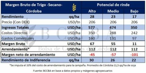 En los tres escenarios planteados los márgenes brutos son positivos, es decir, que el productor que coseche trigo podría cubrir sus costos directos y los gastos comerciales necesarios. La situación cambia al momento de incorporar el costo del arrendamiento, en tal caso el margen se vuelve negativo para todos los planteos.
