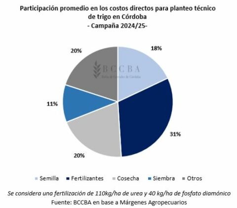 Otro factor importante es el costo de los insumos. Entre ellos, los fertilizantes tienen la mayor incidencia dentro del costo directo que deben afrontar los productores, con una ponderación que en promedio rondaría el 31%. Le sigue el costo de cosecha y de semillas con una participación en el total del 20% y 18%, respectivamente. Esta situación, se observa en un planteo con un paquete tecnológico que apunta a mayores rendimientos.