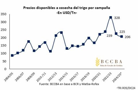 El precio que se espera a cosecha, se posiciona alrededor de los USD 206 Tn. Si bien podría sufrir cambios, al momento se observaría una disminución del 8% respecto de los USD 225 Tn observados en promedio, durante el ciclo 2023/24.