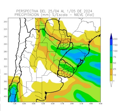 • El este del NAO, la Región del Chaco, el sudeste del Paraguay, gran parte de la Mesopotamia y la mayor parte del Uruguay observarán precipitaciones moderadas a abundantes (25 a 50 mm) con focos con valores escasos