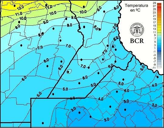 En la región núcleo, el detalle de las estaciones de la red GEA/BCR muestra los menores en el norte de Buenos Aires: Chacabuco registró 2,2°C; General Pinto 2,3°C y Lincoln 3°C. En el resto de la región, los registros superan el umbral de sobrevivencia de la chicharrita, estando por encima de los 4°C.