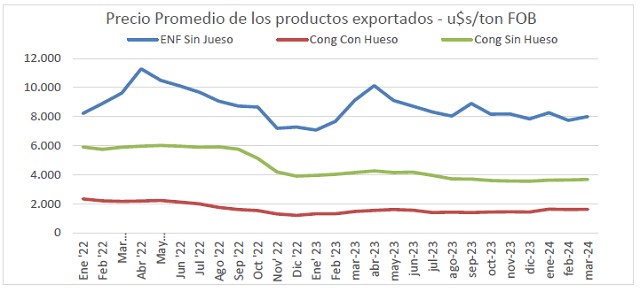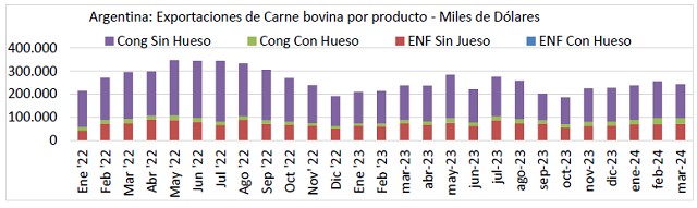 En marzo de 2024, se exportaron 39,8 mil toneladas de carne bovina congelada sin hueso, por un valor de 145,8 millones de dólares. El precio promedio de las exportaciones de carne bovina congelada sin hueso resultó de 3.667 dólares por tonelada. Como consecuencia de menores embarques con destino a China, los volúmenes exportados de carne congelada deshuesada caen moderadamente, con una variación de un (-9,3%) con respecto al mes precedente; y sin embargo resultan (+9,5%) superiores a los volúmenes embarcados en marzo de 2023. En los primeros tres meses del año 2024, las exportaciones de esta partida alcanzaron las 125,0 mil toneladas; un (+17,6%) por encima de las 106,4 mil toneladas registradas entre enero y marzo de 2023. El ingreso de divisas por exportaciones de carne bovina congelada deshuesada a lo largo de los primeros tres meses de 2024 resultó cercano a 455,0 millones de dólares; un (+5,9%) superior a los 429,6 millones que se habían facturado entre enero y marzo de 2023.