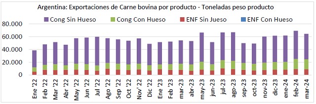 Las exportaciones del mes de marzo de 2024 alcanzaron un volumen cercano a las 64,4 mil toneladas peso producto de carne bovina refrigerada y congelada; por un valor del orden de los 242,5 millones de dólares. Con respecto al mes de febrero de 2024, los volúmenes embarcados muestran una moderada caída, del (-6,8%); mientras que el valor obtenido muestra un retroceso del (-4,9%)