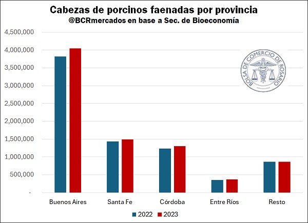 Consultando nuevamente los datos de la Secretaría de Bioeconomía, puede observarse que en 2023 en Argentina se faenaron 8,1 millones de cabezas porcinas. De ese total, el 18,4% de la faena se realizó en establecimientos productivos de Santa Fe, alcanzando las 1,5 millones de cabezas.