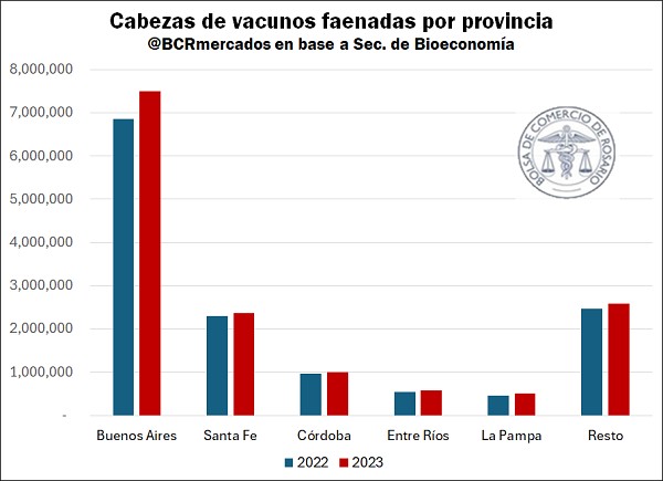 La provincia de Santa Fe es la segunda en importancia, luego de Buenos Aires, en cuanto a la faena de ganado vacuno. Su participación suele oscilar entre el 16% y el 18%. En 2023, en los establecimientos productivos de la provincia litoraleña se faenaron 2,4 millones de cabezas, dando cuenta del 16,3% del total nacional.