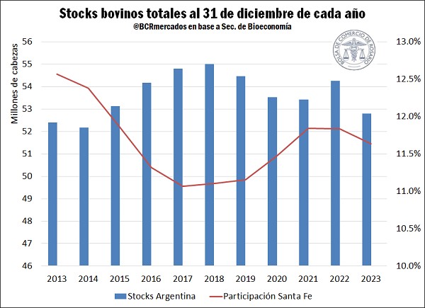 El hecho de que 2023 haya sido un año de liquidación se puede verificar al consultar la serie de stocks bovinos proporcionada por la Secretaría de Bioeconomía. En la misma, se comprueba que al 31 de diciembre de 2023, los stocks bovinos totales de Argentina alcanzaron las 52,8 millones de cabezas, cayendo un 2,7% interanual y alcanzando su valor mínimo en nueve años. En la provincia de Santa Fe se encuentra alrededor del 12% de todo este ganado, por detrás de Buenos Aires que acapara el 37% del mismo.
