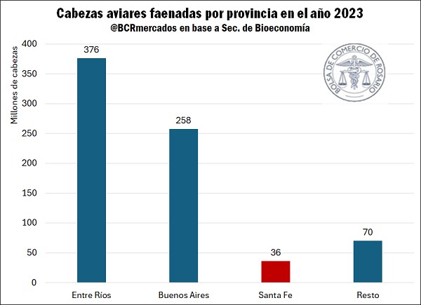 De esta manera, de las 740 millones de aves faenadas a nivel nacional durante el 2023, sólo 36 millones fueron en el territorio provincial, es decir, un 5%, pero que fue suficiente para ocupar el tercer puesto del podio. Tal como se aprecia en el cuadro siguiente, Entre Ríos es la provincia que mayor número de aves faena, representando un 51% del total, mientras que provincia de Buenos Aires ocupa el segundo lugar con un 35%.