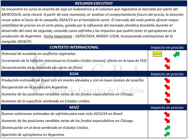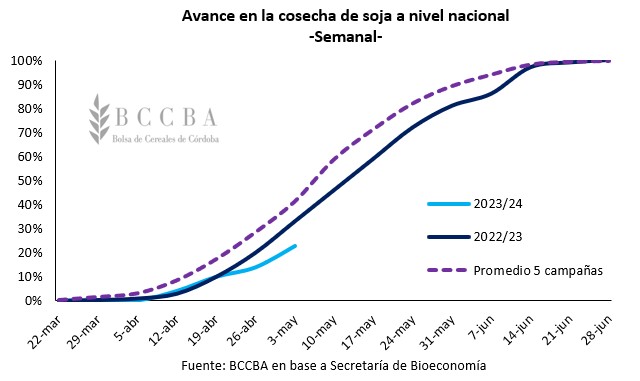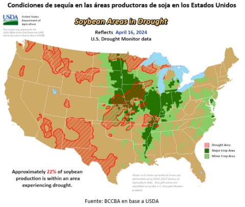 Según distintas fuentes, como la Secretaría de Bioeconomía, Bolsa de Comercio de Rosario (BCR) y la Bolsa de Cereales de Buenos Aires (BCBA), la producción argentina de soja rondaría los 50 millones de toneladas. Por otra parte, la BCBA estima que al 24 de abril el 76% de la soja se encuentra en condiciones normales a buenas (durante la campaña pasada este porcentaje su ubicaba en el 39%). Mientras que el 82% de los lotes presentan una condición hídrica entre adecuada/óptima (en comparación al 52% observado durante el ciclo 2022/23).