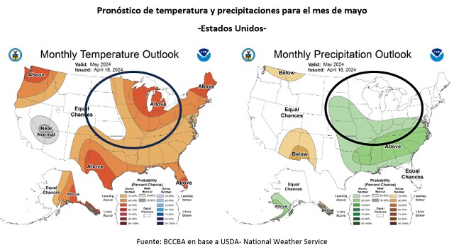 En Estados Unidos, se estima una disminución en el área a sembrar con maíz para la campaña 2024/25, cayendo un 5% respecto la campaña precedente y ubicándose en torno a los 36,4 millones de hectáreas. Al momento, se presenta un avance de siembra sobre el 12% del área destinada al cereal, porcentaje que se encuentra en línea con lo observado el año previo. En las próximas semanas se espera que se intensifiquen las labores considerando que, en promedio, a mediados de mayo ya se suele contar con el 80% del área implantada. Para dicho mes, se pronostican temperaturas por encima de lo normal en el “cinturón del maíz” estadounidense, mientras que las precipitaciones estarían en los niveles normales o en algunos casos ligeramente por encima de la media. Respecto a las existencias de cereal al mes de marzo, las mismas se incrementaron un 13% respecto a marzo del 2023, alcanzando los 212 millones de toneladas.