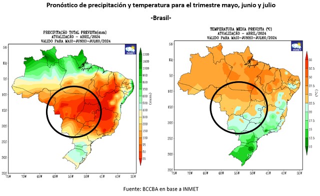 El mercado climático que acompañará al cultivo durante su desarrollo, será una variable para considerar al momento de analizar el precio del maíz. Para el trimestre de mayo, junio y julio, se prevé precipitaciones por debajo de la media en gran parte de la región centro-este (Mato Grosso, Mato Grosso du Sul y Goiás). En cuanto a la temperatura, también se ubicaría por encima de la media en dicha región, teniendo como excepción gran parte del estado de Mato Grosso do Sul.