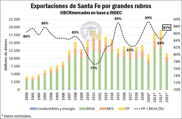 Extendiendo la mirada al plano exportador, la agroindustria emerge como el principal rubro que aporta divisas a nuestra provincia. Tomando como referencia las exportaciones de Productos Primarios (PP) y las Manufacturas de Origen Agropecuario (MOA), los datos del Instituto Nacional de Estadística y Censos (INDEC) advierten que la agroindustria fue responsable del 87% de las ventas externas de Santa Fe en 2023. Esto se muestra en línea con lo observado en términos históricos, siendo que desde el año 2000 en adelante la participación del sector agroindustrial siempre se ubicó en un rango entre 77% y 89% del total exportado.