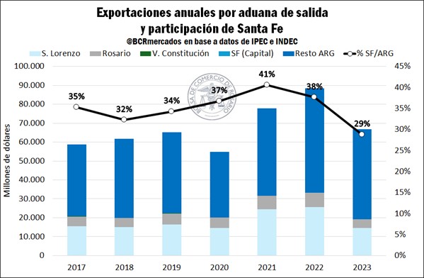Otro aspecto que resulta importante mencionar es el rol de Santa Fe como salida de las exportaciones argentinas, más allá del origen de la producción. Para ello, se observaron los datos de las exportaciones por aduana de salida del Instituto Provincial de Estadística y Censos (IPEC), los cuales muestran el último registro aduanero de los bienes antes de salir del país, aunque los mismos no sean necesariamente producidos en la provincia de Santa Fe.