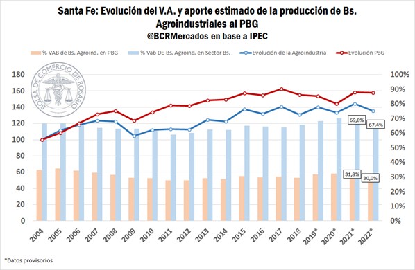 El valor agregado del sector agroindustrial santafesino se incrementó 44% entre los años 2004 y 2021 a un ritmo promedio anual del 2,18%, siendo el año 2021 el de mejor performance a valores constantes. Aquel año convivieron una producción récord de maíz y trigo a nivel nacional junto con una cosecha de soja regular, que, conjugada con excelentes precios internacionales, impulsaron la dinámica productiva sobre la región santafesina y la rama agroindustrial llegó a representar el 32% del agregado de valor a nivel provincial.
