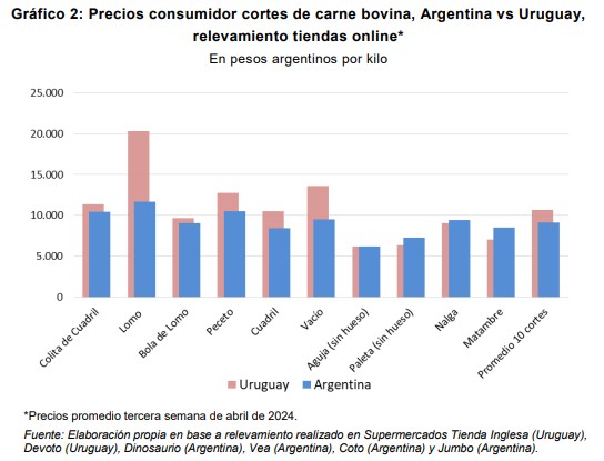 Con el objeto de tener una comparación más actualizada se relevaron precios de 10 cortes en Argentina y Uruguay en supermercados que cuentan con tiendas online, en la tercera semana de abril de este año. En el caso de Argentina, se registraron precios de supermercados Jumbo, Vea Coto y Dinosaurio Mall, mientras que para Uruguay se hizo lo propio con los supermercados Tienda Inglesa y Devoto.