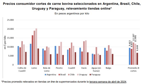 • Como se mencionase, se realizó un relevamiento en tiendas on line de supermercados en la tercera semana de abril en los tres países antes mencionados (Argentina, Uruguay y Chile) y también en Brasil y Paraguay. Esta medición alcanzó a 21 supermercados y más de 180 precios de cortes de carne bovina de los 5 países, encontrándose que el precio medio de una canasta de 8 cortes de calidad media/alta era de $9.413 por kilo en Argentina, de $8.855 por kilo en Brasil, de $6.644 en Paraguay, de $11.681 en Uruguay y de $12.397 en Chile.