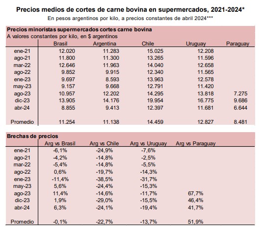 Los precios de los supermercados revelan que el país sigue teniendo, incluso después de las últimas subas de la hacienda y los elevados niveles de inflación, una carne bovina más barata que en Uruguay y Chile. También muestra que la carne cuesta casi lo mismo que lo que vale en Brasil, país que, debe recordarse, es exportador líder y posiblemente ostente la mayor competitividad a nivel mundial (menores costos) en materia de precios de hacienda y carne bovina.