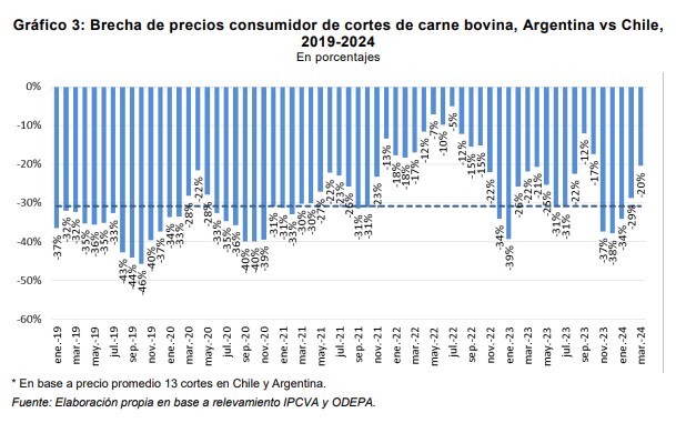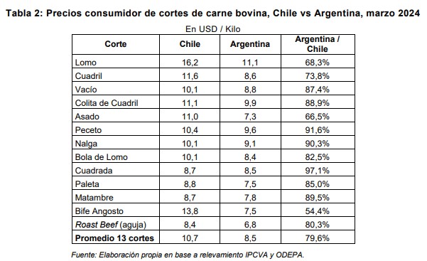 El precio medio de 10 cortes relevados en Chile es de $11.704 (pesos argentinos por kilo), mientras que en Argentina de $9.106, lo que equivale a una brecha del 22,2% a favor de Argentina (nótese que este porcentaje es ligeramente mayor al que surge de la comparación de precios de fuentes oficiales para el mes de marzo)