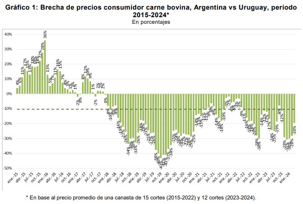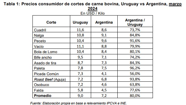 Según este relevamiento, el precio promedio del kilo de carne de una canasta de 10 cortes se encontraba en Argentina un 14,7% por debajo de Uruguay, un tanto menor que la magnitud que surge a partir de la comparación con fuentes oficiales.