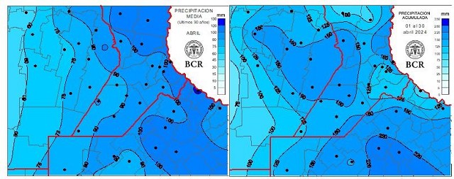La media de todo abril para la región núcleo es de 90 mm, con grandes diferencias entre este y oeste. Sin embargo, en abril 2024 el promedio que arrojan las 36 estaciones de la red GEA / BCR es de 147 mm, superando la estadística por un 63,3%.
