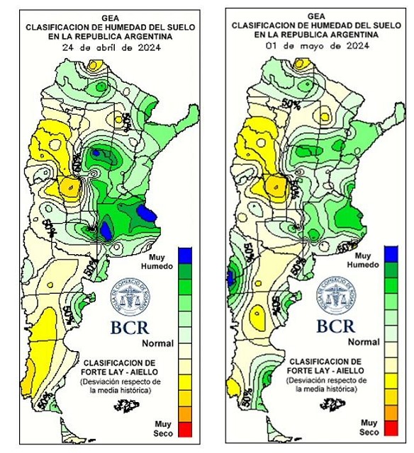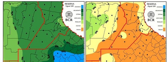 Buena parte del centro y NO de la región núcleo recibió lluvias de 150 a 200 mm. En el NE bonaerense hay localidades que superaron los 200 mm, como en Junín con 251 mm o Chacabuco con 235 mm. Incluso en las localidades con los menores registros de la red, abril cumplió con lo que prometía: Carlos Pellegrini alcanzó los 90 mm y Ramallo los 88 mm. Es destacable como las lluvias de abril rompieron el patrón de lluvias que se había expresado en marzo con descargas que quedaban casi restringidas al este. En cambio, abril deja en algunas áreas cordobesas registros que están muy cerca de los 200 mm como Monte Buey (197 mm) o Guatimozín (187 mm). Estas descargas que no son frecuentes tienen que ver con el atípico posicionamiento en áreas más mediterráneas de un centro de baja presión que mantuvo el mal tiempo. “El Niño” también colaboró con el ingreso de un mayor nivel de humedad en la región. Esto ha causado una gran demora en la cosecha gruesa, pero deja planteado un ambiente de alta productividad para el trigo de la nueva campaña, como se observa al comparar con las reservas de agua para una pradera permanente de esta semana con la de un año atrás.