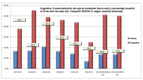 Al día 24 de abril – fecha del último dato oficial– las ventas de soja 2023/24 apenas llegaban a 13,56 millones de toneladas.