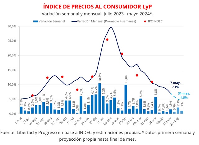 Lautaro Moschet, economista de la Fundación Libertad y Progreso, advirtió que "la inflación mensual de mayo se perfila para ser mucho más baja que en los meses previos. Aun manteniendo constante la inflación núcleo, la menor presión de los regulados impulsará la baja de este mes. A su vez, esto generará mejoras en el poder de compra de los salarios, los cuales ya comenzaron a mostrar signos positivos en algunos indicadores de febrero y marzo".