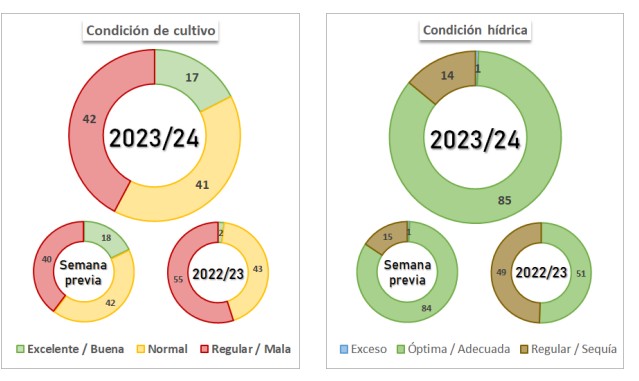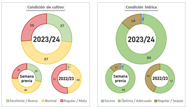 El 36 % del área en la zona centro y norte del país reporta una condición Normal/Buena, solo 4 p.p. por encima del ciclo previo. Con un avance de cosecha del 23,4 %, mantenemos la proyección de producción en 46,5 MTn.