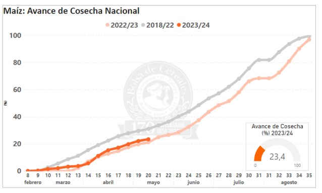 Por otro lado, la cosecha de maíz grano comercial avanza lentamente producto de la elevada humedad en los granos. Hasta el momento, se ha cosechado el 23,4 % del total nacional (+2,2 puntos porcentuales vs. ciclo previo) con un rinde medio de 86,8 qq/Ha. Colaboradores del centro y norte del área agrícola han comenzado la cosecha de planteos tardíos dos semanas antes de lo previsto para evitar mayores pérdidas por vuelco, producto del debilitamiento de las cañas que ha ocasionado la infección causada por el complejo de enfermedades asociadas a la chicharrita. Si bien se comenzó con lotes puntuales, los resultados de estos primeros avances confirmarían el efecto provocado por la plaga.