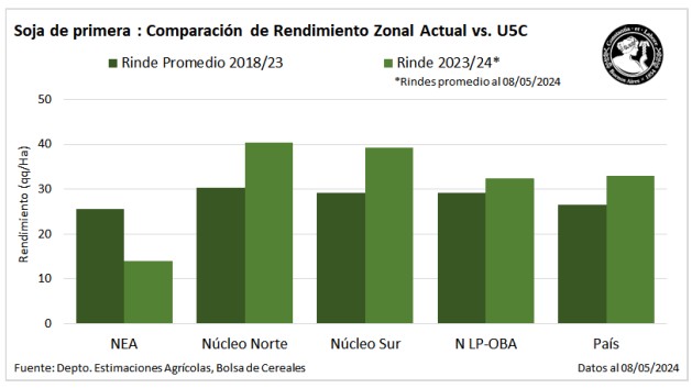 Con un avance del 47,8 % de la superficie apta a nivel nacional, el rinde promedio se ubica en 32,1 qq/Ha. Se recolectó el 56,1 % de la soja de primera y el 25,7 % de la de segunda, con buenos rindes sobre ambos núcleos.