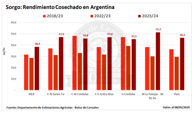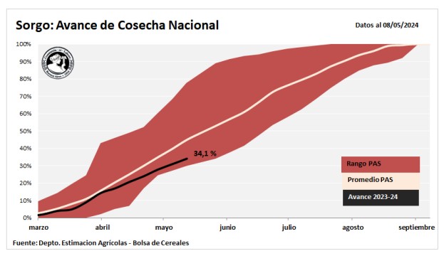 La cosecha de sorgo granífero alcanzo al 34,1 % del área apta con un rinde medio de 46,3 qq/Ha. Se reportan pérdidas por presencia de aves y, en planteos de fecha tardía, por estrés térmico en el norte agrícola.